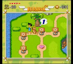 The game itself first involves a world map representing a themed set of worlds. Rolling the dice results in either Fred or Barney moving to the appropriate space on the board. Depending on the landed space, the player must clear a level in that particular world, defeat bosses, or enter shops, among other things. On some zones, Wilma and Betty appear and if any one of them manage to meet their respective husband, she will drag him some spaces back to an arbitrary location.[1] Moving the players in the game is similar to playing a Japanese sugoroku board game.[4]