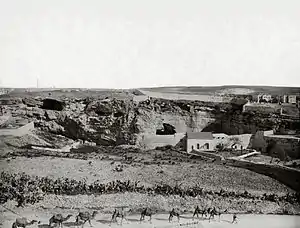 Based on topographical and textual considerations, Conder argued that it would be dangerous and unlikely, from a town-defense point of view, for the walls to have previously been east of the Church of the Holy Sepulchre, concluding that the Church would have been inside the city walls and thus not the authentic tomb of Christ.[27] He instead proposed that the true Calvary was the "rounded knoll" above Jeremiah's Grotto (i.e. Skull Hill). He based this identification on several arguments. First of all, since the Gospel according to John places Golgotha in the near vicinity of a garden and a tomb (John 19:41–42) Conder argued that Golgotha must be close to the necropolis found just north of Jerusalem, near the main road to Nablus, "among the olive-gardens and vineyards of Wady el-Joz". Secondly, Conder proposed that Calvary was the public place of execution and especially noted that Sephardic Jews had regarded the site next to Jeremiah's Grotto as traditionally being a place of stoning, which he saw as corroborative evidence that it was indeed Golgotha. He also pointed to a Christian tradition which associated that general area with the martyrdom of St. Stephen as additional evidence that it was a public place of execution during the New Testament era. Conder actually downplayed the supposed resemblance to a skull which he viewed as immaterial, remarking: "I should not like to base an argument on so slight a resemblance". In his writings Conder refers to Skull Hill by the Arabic name El-Heidhemiyeh which he interpreted as "the rent", and which he proposed was a corruption of El-Heiremiyeh – "the place of Jeremiah".[28][29][12][30] However, later research has shown that the name is actually a corruption of El-Adhamiyeh, named after a zawiya which according to Muslim tradition was founded by the celebrated Sufi saint Ibrahim ibn Adham.[7][31] Charles Wilson spelled the name as El Edhemîyeh.[32]