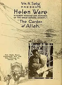 The Garden of Allah is a 1916 American silent drama film directed by Colin Campbell and starring Helen Ware, Tom Santschi and Eugenie Besserer.[1] It is based on the 1904 novel of the same title by Robert Smythe Hichens, adapted a number of times including a 1937 sound film starring Marlene Dietrich. Location shooting took place in the Mojave Desert.