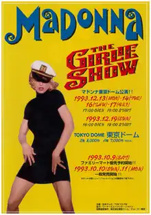 The tour was set to kick off at London's Wembley Stadium on September 25, 1993.[8] Madonna then said she was "not interested in preaching to the converted", hence why she decided to begin The Girlie Show in London; "I am going to the places where I have the most enemies", she explained.[8] It was initially planned not to visit the United States, instead focusing on regions the singer had never toured before, such as Turkey, Israel, Mexico, Puerto Rico, Argentina, Brazil and Australia. However, due to demand, some shows were booked in certain US cities.[9] A concert in Beijing's Workers' Stadium was also planned; the official China News Agency reported that she would be allowed to perform as long as there wasn't include any "indecent exposure" in the show. Madonna allegedly agreed, since she was interested in visiting the country. However, said concert never happened.[10] A promotional extended play, titled The Girlie Show, containing all six singles from Erotica, was released in Brazil to commemorate the singer's visit.[11] Similarly, limited editions of Erotica and The Immaculate Collection (1990) were released exclusively in Australia.[12][13] The tour was then chronicled in a photo book of the same name, released in November 1994. This release included a CD with three live tracks: "Like a Virgin", "In This Life", and "Why's It So Hard". Madonna wrote in the book: