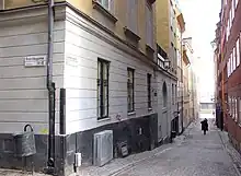 In the Johannesgränd/Österlånggatan corner (marked as VII on the map) lies one of the blocks largest houses. The house is shaped like a horseshoe and has an underground courtyard facing Johannesgränd. The building has a rusticated and plastered facade, which was added in the late 18th century, and a painted socle. Dimension stones wrap around the portal. There is a store on the bottom floor.
