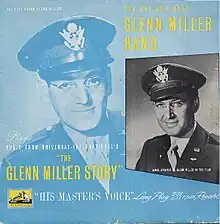 The Glenn Miller Story is a compilation album of tracks recorded by the Glenn Miller Band between 1939 and 1942 which had been released as 78 rpm singles on the Bluebird and Victor labels.[1] It was released in the United Kingdom in 1954 as a ten-inch 33+1⁄3 rpm monophonic LP on the His Master's Voice label, catalogue number DLP 1024.[2] The front cover of the album shows monochrome photographs of Glenn Miller and James Stewart, both in the uniform of a major in the United States Army Air Forces. The full title (shown only on the front cover of the album) is The One and Only Glenn Miller Band Plays Music from Universal-International's "The Glenn Miller Story", but the film featured different recordings of the same tracks.[1]