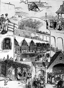 The Marina was opened by the Mayor of London (Sir Thomas White) on Thursday 5 July 1877. The architect was J T Wimperis and the contractor was Messrs Paramor and Son, of Margate. In the early 1970s the shops were converted into private flats. Numbers 1-4 were Grade II listed on 21 December 2004.[1] Number 1 Granville Marina, formerly a photographic studio (Frederick T Palmer), was demolished in February 2008.