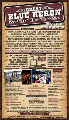 According to the Roster of Past Performers,[3] artists who have performed at the Great Blue Heron Festival include 10,000 Maniacs, Alison Pipitone, Armor & Sturtevant, Baby Gramps, Bombadil, Donna the Buffalo, Hypnotic Clambake, Jim Donovan, John & Mary, Kate Jacobs, Lightnin' Wells, Los Straitjackets, Peacefield, Rusted Root, Say Zuzu, Slobberbone, Slo-Mo, Southern Culture on the Skids, Steve Riley and the Mamou Playboys, The Avett Brothers, The Big Wu, The Burns Sisters, The Campbell Brothers, The Horse Flies, The Mighty Wallop!, The Mollys, The Red Stick Ramblers, The Tarbox Ramblers, Tim O'Brien, Tony Vacca, Zekuhl, and Zydeco Experiment.