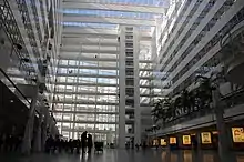 It is located in the new city centre, and incorporates the council chamber, the main public library, as well as cafés, exhibition spaces, and a wedding room. At its centre is a large atrium, flanked by two large slab buildings 10- and 12-storey tall. The library is located at the northwestern end of the building complex in a semicircular building.[1]