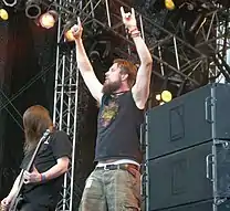 Original drummer Adrian Erlandsson now returned to the band also, and Ola Englund from Six Feet Under was brought in as the band's new lead guitarist.[14] The band then began writing for an EP titled Eye of the Storm, which was released on 20 January 2014 in Europe and 21 January 2014 in North America.[15] The band had already been rehearsing before the announcement of the new lineup, and their first live performance followed at the 70000 Tons of Metal which set sail 27–31 January 2014.[16]