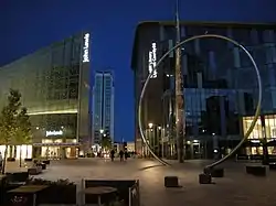 Alliance is a 25 metres (82 ft) high sculpture in The Hayes. The sculpture consists of a large stainless steel and enamelled metal arrow column and a hoop, which glows in the dark, and falls and rises with the tide. Paid for by the St David's shopping centre as part of a £1.5m public art scheme in the city centre, it was installed in the space between the new mall and Cardiff Central Library[3]