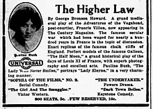 The Higher Law is a 1914 American silent drama film directed by Charles Giblyn and featuring Murdock MacQuarrie, Pauline Bush and Lon Chaney. It was written by Harry G. Stafford, based on a story by George Bronson Howard. This film was the second in a series of four films called The Adventures of Francois Villon. Lon Chaney was featured in this one, as well as in the first installment, The Oubliette (1914), but did not appear in the other two. The film is now considered to be lost.[1]