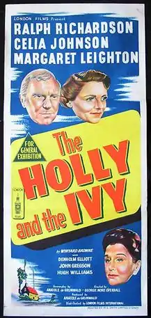 The Holly and the Ivy is a 1952 British drama film directed by George More O'Ferrall and starring Ralph Richardson, Celia Johnson, and Margaret Leighton with Denholm Elliott, John Gregson and Hugh Williams also in the cast. It was adapted from the 1950 play of the same name by Wynyard Browne.[4] Produced by Anatole de Grunwald and co-scripted by Browne and de Grunwald it was distributed by British Lion Films. It is about an Irish clergyman whose neglect of his grown offspring, in his zeal to tend to his parishioners, comes to the surface at a Christmas family gathering.