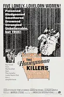 The Honeymoon Killers is a 1970 American crime film written and directed by Leonard Kastle, and starring Shirley Stoler and Tony Lo Bianco. Its plot follows a sullen, overweight nurse who is seduced by a handsome con man, with whom she embarks on a murder spree of single women. The film was inspired by the true story of Raymond Fernandez and Martha Beck, the notorious "lonely hearts killers" of the 1940s.