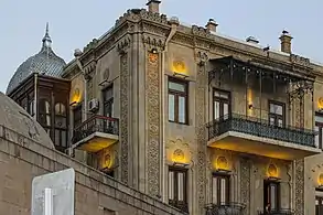 The Ramazanovs' house was built in 1895 by order of merchant Haji Mammadkarim Ramazanov. The building belonged to Haji Mammadkarim Ramazanov and his wife Umbulbanu. The four-storey building was built in a national-romantic style. Arches extending from the second floor to the last floor, as well as the language of the concha, referring to the stalactic system of the wooden balcony of the top floor, the domes and stone carvings give the building a special beauty. Elements of oriental architecture were used in the façades. On the first floor of the building, Haji Mammadkarim opened an electric theater called "Ermes". The second floor was leased to the famous businessman Rahim khan. On the third floor there were shops selling jewelry. The Ramazanov family lived on the fourth floor. "Mugham nights" were organized from time to time on the wooden balcony of the building. The patterned balcony was the resting place of the Ramazanovs. The patterns on this balcony have an interesting symbolic meaning. Thus, the leaf-shaped patterns on the balcony symbolize that Baku is a windy city.[1] The house where the Ramazanov family lived was divided into separate apartments during the Soviet era and distributed among the population[3]