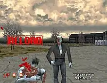 The enemy designs were drafted quickly, going from idea directly to design drawing without any rough sketches.[7] Anticipating that foreign markets, particularly Germany, would require the violence be toned down, they built in an option for operators to change the color of the game's blood, with green, purple, and blue available in addition to the traditional red.[7] They also cut a female zombie from the game because they felt she looked too much like a normal elderly woman, which could provoke controversy given that the player is encouraged to shoot the zombies.[7] The Chariot was animated by using motion capture with an actor wielding a broom, but the other enemies were all animated manually, using motion capture for reference only.[7]