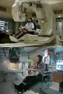 Leterrier had planned to use prosthetic makeup and animatronics to complement the computer-generated imagery that was solely used in the previous film.[78] The make-up artists who worked on X-Men: The Last Stand were set to portray Blonsky's gradual transformation,[24] which Zak Penn said would portray Blonsky "not [being] used to having these properties. Like he's much heavier, and we talked about how when he walks down the sidewalk, his weight destroys the sidewalk and he's tripping. [It's all about] the humanization of these kinds of superhero characters, showing the effects physics may actually have on [them]."[79] Tom Woodruff, Jr. of Amalgamated Dynamics (who created all the costumes for the Alien films since Alien 3) was in negotiations, and created two busts of the Hulk and prosthetic hands to act as stand-ins for the character. A full animatronic was never created as it was decided it would complicate production to set up shots for a puppet and then a computer graphic.[80] An animatronic was used for Sterns' mutating head, however.[63] Destruction was mostly done practically. A model of a bottling machine was smashed through a wall for when the Hulk escapes the factory. The filmmakers used steam and dry ice for the gas used to smoke out the Hulk, and they destroyed a real Humvee by dropping a weight on it when shooting the Culver University battle. Pipes blew fire for when the Hulk strikes down the computer-generated helicopter. When Banner falls from the helicopter to trigger the Hulk into fighting the Abomination, Norton was attached to a surface held by a bar which turned 90 degrees while the camera was pulled to the ceiling to simulate falling. Leterrier jokingly remarked that making Norton fall that distance would obviously render him unable to act.[28]