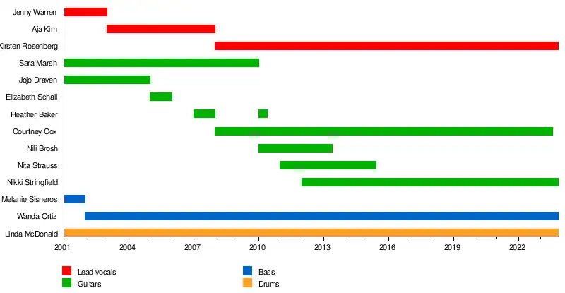 In summer 2008, Heather Baker and Aja Kim left the band to pursue solo careers.[10] The two were replaced by guitarist Courtney Cox and vocalist Kirsten Rosenberg (formerly of the Maryland-based cover band HighWire).[11] In January 2010, Marsh, who was ill, was taken off some of the Japanese tour shows and did not rejoin the band.[12] Baker rejoined the band to temporarily fill in Marsh's spot for a handful of shows.[12]