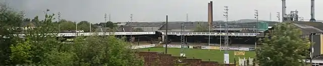 The Railway End is at the south of the ground. It is an uncovered standing terrace, with a supporters' club, executive boxes and a scoreboard along its top. It is mainly used by away supporters.