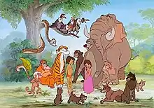 There are two video games based on the film: The Jungle Book was a platformer released in 1993 for Master System, Mega Drive, Game Gear, Super NES, Game Boy and PC. A version for the Game Boy Advance was later released in 2003.[98] The Jungle Book Groove Party was a dance mat game released in 2000 for PlayStation and PlayStation 2.[99][100] Kaa and Shere Khan have also made cameo appearances in another Disney video game, QuackShot.[101] A world based on the film was intended to appear more than once in the Square Enix-Disney Kingdom Hearts video game series, but was omitted both times, first in the first game because it featured a similar world based on Tarzan,[102] and second in Kingdom Hearts: Birth by Sleep, although areas of the world are accessible via hacking codes.[103] Baloo and Mowgli appear as interactive characters in Adventureland on Kinect: Disneyland Adventures released in 2011 and re-released in 2017.[104] Mowgli, Bagheera, Baloo, Shere Khan and King Louie appear as playable characters in the video game Disney Magic Kingdoms.[105][106] Baloo appears as a playable character on Disney Mirrorverse released in 2022.[107] Baloo and Mowgli appear as a playable characters on the kart racing game Disney Speedstorm released in 2022.[108] Since the film's release, many of the film's characters appeared in House of Mouse, The Lion King 1½, Who Framed Roger Rabbit, and Aladdin and the King of Thieves.[109] In December 2010, a piece of artwork by British artist Banksy featuring The Jungle Book characters which had been commissioned by Greenpeace to help raise awareness of deforestation went on sale for the sum of £80,000.[110]