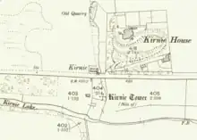 Approximately 80 meters to the south of The Kirna's perimeter wall, across the A72, is the site of Kirnie Tower. Its site was pointed out in 1856 by residents of Walkerburn who were present at its removal in circa 1840 when its stones were removed for building purposes elsewhere on the Horsburgh estate. Long after its dismantlement it was used as a shepherd's hut.[86] Maps published as far back as 1654 refer to "Kirn" or "Kirna" in approximately the location of Kirnie Tower.[87] Ordnance Survey Name Books in the mid-1800s record the structure as "one of the ancient feudal residences erected for the protection of the Borders. It was square in appearance".[88][89][86]