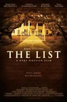 The List is a 2007 American thriller film directed by Gary Wheeler and based on the novel of the same name by Robert Whitlow. The film was shot in Wilmington, North Carolina. It stars Malcolm McDowell, Chuck Carrington, Hilarie Burton and Will Patton. The List was released on April 22, 2007, and grossed $138,814 at the US box office. It was released on DVD by 20th Century Fox in 2008.