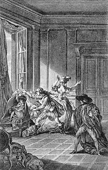 The scholar and translator John Wood writes that the play was probably completed in more or less its existing form by 1778.[7] It was accepted for production by the management of the Comédie Française in 1781, after which three years elapsed before it was publicly staged. Initially the text was approved, with minor changes, by the official censor, but at a private reading before the French court the play so shocked King Louis XVI that he forbade its public presentation.[8] Beaumarchais revised the text, moving the action from France to Spain, and after further scrutiny by the censor the piece was played to an audience including members of the Royal Family in September 1783. The censors still refused to license the play for public performance, but the king personally authorised its production.[9]