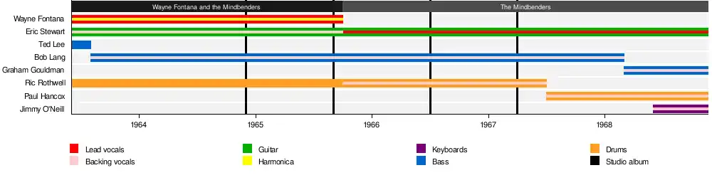 | Past members | Wayne Fontana Bob Lang Ric Rothwell Eric Stewart Geoff Foot Paul Hancox Graham Gouldman Jimmy O'Neil |