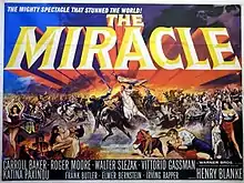 The Miracle is a 1959 American historical drama film directed by Irving Rapper and starring Carroll Baker and Roger Moore. It is a remake of the 1912 hand-colored, black-and-white film The Miracle, which was in turn a production of the 1911 pantomime play, The Miracle, written by Karl Vollmöller and directed by Max Reinhardt.