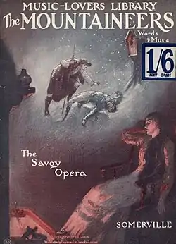 Somerville is credited with the conception of The Mountaineers. He was travelling in a train through the Rhine Valley when the idea came to him: "I had been glancing idly at a guide book, but the opening lines of a quaint legendary tale relating to some little village in the mountains suddenly held my interest, and when I had read it through I realised that here was the ideal story for an opera. Only the climax would have to be altered, for the story ended on a tragic note."[8] Somerville showed The Mountaineers to Workman, who was at once interested. He assembled several financial backers and formed the Comic Opera Syndicate.[9] The press referred to the work as a Savoy opera.[10]
