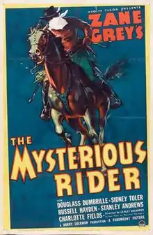 The Mysterious Rider is a 1938 American Western film directed by Lesley Selander and starring Douglass Dumbrille, Sidney Toler, and Russell Hayden. Written by Maurice Geraghty based on the 1921 novel The Mysterious Rider by Zane Gray, the film is about a notorious outlaw who returns to the ranch he once owned and takes a job disguised as a ranch hand. Unrecognized by the ranch's current owner, he waits patiently for an opportunity to expose the men who murdered his partner twenty years ago, framed him for the crime, and then stole his ranch.[1] The film was later released for television in the United States as Mark of the Avenger.