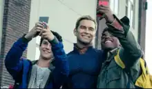 ![]() Homelander allowing two kids to take a photo with him, after saving them from bank robbers. | |