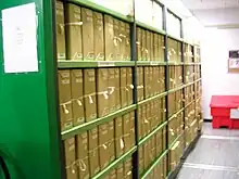 The documents are stored on mobile shelving – double-sided shelves, which are pushed together so that there is no aisle between them. A large handle on the end of each shelf allows them to be moved along tracks in the floor to create an aisle when needed.