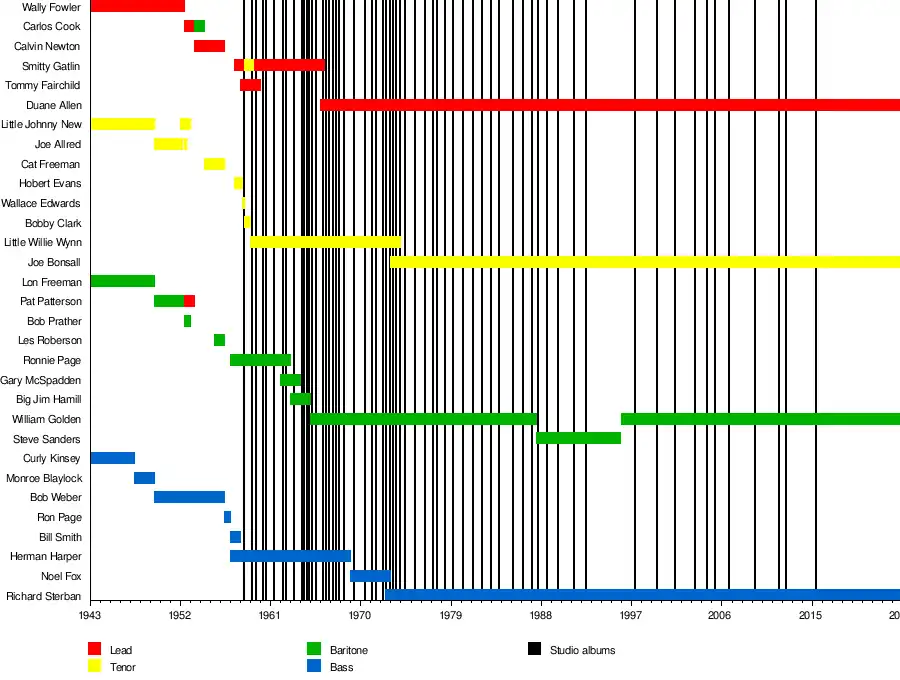 ![]() The Oak Ridge Boys in 2013 (From left: Joe Bonsall, Duane Allen, William Lee Golden, and Richard Sterban) | |