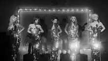 For their variety show The Girls Aloud Party, which aired between The X Factor's finale and its results show on 13 December, Girls Aloud wore tight silver fishtail dresses.[55] At the 2009 BRIT Awards, Girls Aloud performed in sleeveless sequined leotards. Accompanied by male dancers in white suits, the group performed a routine involving pink feather fans, giving the illusion of nudity until they emerged from behind the fans. The performance was nominated for Most Memorable Performance the following year at the 2010 BRIT Awards.[56]