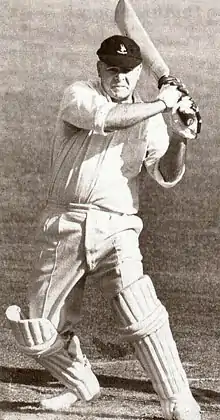 The following season, in 1922–23, an English cricket team toured. Just like nine years, previous Taylor was at his best. In the first Test at Johannesburg, he batted at number three and in the second innings scored a superb 176, the next highest score in the match was 50.[31] Taylor's knock included 25 boundaries and was the largest by a South African against England.[32] South Africa won the Test by 168 runs, it was Taylor's first victory as captain and as a Test player.[33] He followed that in the second Test with scores of 9 and 68 as England narrowly won by one wicket.[34] In the third Test at Durban he was moved back up to open the innings, he scored 91 and shared 110 with Bob Catterall. The third day's play was washed out leaving the draw inevitable in a four-day match.[35] The fourth Test was also drawn, Taylor scored 11 at number four and then moved back as the opener in the second innings made 101. Wisden wrote: "Taylor, who hit out freely when fear of defeat had gone, played a masterly game, but he had a little luck".[36] With the series still level at 1–1, the fifth and final Test was made Timeless to ensure a winner of the series. England's C. A. G. Russell scored two centuries in the match and South Africa were set a target fourth innings target of 344. Taylor, at number four, batted for four and a half hours over an innings of 102 however he received little support from his teammates and South Africa lost by 109 runs.[37] Taylor finished the series with 582 runs at 64.66 and was the highest scorer on either side, his total was 278 more than the next South African.[38] His series total was at the time a Test record for a captain, later surpassed by Don Bradman in 1936.[39] His three centuries in the series set a South African Test record which was only bettered in 2003/04 by Jacques Kallis.[40] The Wisden report of the series recorded that "H. W. Taylor as a batsman was in a class by himself".[41] The series cemented Taylor's position as a leading batsman in the world.