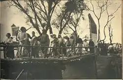 In reference to the photo that shows women and children walking across a bridge with Japanese soldiers, she wrote: