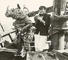 In August 1914—a full year before the film's release—Lubin was already promoting the completed photoplay in trade publications.[6] That prolonged delay in its release was due to several reasons, one being scheduling adjustments linked to Lubin's new distribution partnership with three other film studios: Vitagraph, Selig, and Essanay.[10] Under the incorporated title "V-L-S-E", the companies by early 1915 were coordinating the marketing and release dates of their films.[10] In addition, Lubin's financial circumstances had been seriously affected by a disastrous fire in June 1914, just as filming of The Ringtailed Rhinoceros was being completed.[11][12] That blaze destroyed millions of feet of film in the company's main storage vault in Philadelphia. The losses, all of which were uninsured, included extensive collections of original prints, master negatives, stock footage, unused film, and "several features ready for release".[12][13] Fortunately, footage already shot for Hitchcock's debut film was processed or stored elsewhere, for it escaped destruction at that time.