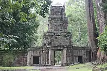 The rectangular place of the royal palace was surrounded by a 5 meters high laterite wall with 246 meters along the north-south axis and 585 meters along the east-west axis, covering an area of more than 14 hectares. Five sandstone gopuras with steps served as the entrance to the palace. Two gupuras are located on the south, other two are on the north, the largest one faces to the east and aligned with the Elephant Terrace and Victory Gate. The first group of buildings, built by king Suryavarman I, was surrounded by a moat on the east. The ground inside the palace compound is 1.2 meters higher than outside that necessitating a double course of stone on the exterior of the entrances and in some places, the ground has been raised even higher.