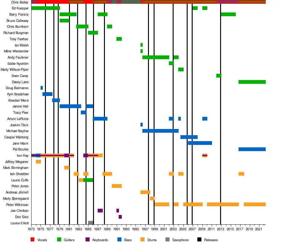 - Chris Bailey – lead vocals (1973–2022; his death), guitar (1980–1983, 1984–1986, 1989–1990, 1991–1996, 1996–2012, 2016–2022), bass (1973–1974, 1989–1996, 2012–2016)