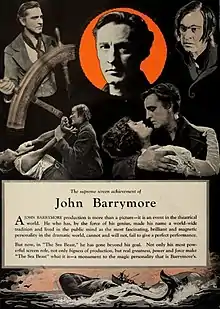 The Sea Beast is a 1926 American silent drama film directed by Millard Webb, starring John Barrymore, Dolores Costello and George O'Hara.[2] The film was a major commercial success and one of the biggest pictures of 1926 becoming Warner Brothers' highest grossing film. The Sea Beast is the first adaptation of Herman Melville's 1851 novel Moby-Dick,[2] a story about a monomaniacal hunt for a great white whale. However, the film alters the novel's plotline by establishing prequel and sequel elements that are not in the original story—such as the romancing of Esther and Ahab's safe return, respectively—and substitutes a happy ending for Melville's original tragic one. Some of the characters in the film do not appear in Melville's original novel. The film was so successful that in 1930 Warner Bros redid it in English and German, under the title Moby Dick, with Joan Bennett taking the role of Ahab's love because Dolores Costello was pregnant at the time.[3]