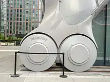 The wraparound shell weighs 8 million pounds (3,600,000 kg), and is made of an exposed steel frame clad in a fluorine-based plastic called ETFE, which has the thermal properties of insulating glass at a fraction of the weight.[37] The shell can close and open within 5 minutes[23] and when the shell is retracted, the open-air plaza becomes a publicly accessible outdoor space.[15][41] The shell retracts on eight bogie wheels, each 6 feet (1.8 m) in diameter,[42] powered by a total of six 15-horsepower motors.[23] The Shed is directly adjacent to 15 Hudson Yards and the High Line.[43]