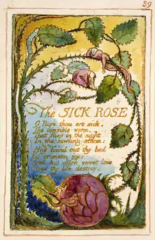 "The Sick Rose" is a poem by William Blake, originally published in Songs of Innocence and of Experience as the 39th plate; the incipit of the poem is O Rose thou art sick. Blake composed the poem sometime after 1789, and presented it with an illuminated border and illustration, typical of his self-publications.[1] Since the 20th century, the poem has been the subject of scrutiny by scholars for its oblique and enigmatic meaning, and bizarre, suggestive imagery.[2]