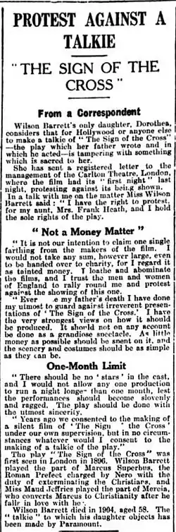- Protest Against a Talkie: "The Sign of the Cross", The Citizen, (Tuesday, January 31, 1933), p.8.