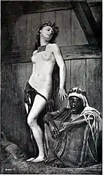 Naked girl, standing, almost full-on, leaning against a wooden partition. Her head tilted to the right, her blonde hair loose and falling, she leans her left hand against the planks. She wears, as a belt, a torn flap of black cloth, held in place by a red cord, which falls down her right leg. On her neck hangs a small label on which is written: Virgo gallica honesta corpore, XVIII annum, etc. [The Latin indicates this is a scene from the ancient Roman world, not from the Arab world, as might be thought from the other figure's burnous.] To the right, at the feet of the young girl, squatting on the ground, both hands on his knees, is a Negro wrapped in a striped burnous with a blue background, his head covered with a pink cloth, crowned with myrtle leaves. On the left, on the straw, a jar.[7]