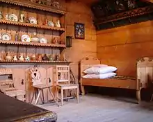The ethnographic exhibition presents, among others, an interior of a typical 19th century Podhale cottage, with two spaces – the "white" and "black" rooms separated by a vestibule. An original entrance door decorated with diagonal wooden pegs – originally part of Stanisław Wójciak's house in Kościeliska – was purchased by the museum in 1905 and now leads to the reconstruction of the cottage. The inside of the cottage presents the way of life of 19th century Podhale families. Daily life concentrated in the ‘black’ chamber, its walls darkened by the smoke from the stove.[4]