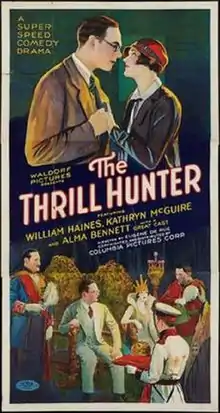 The Thrill Hunter is a 1926 American silent comedy adventure film directed by Eugene De Rue and starring William Haines, Kathryn McGuire, and Alma Bennett.[1] An American is mistaken for the ruler of a small European principality, and forced to marry. He manages to escape, and publishes an account of his adventures.