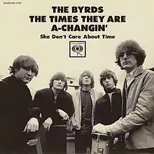"The Times They Are a-Changin'" was one of two Dylan covers that the Byrds included on their second album, Turn! Turn! Turn!, "Lay Down Your Weary Tune" being the other.[13] Like other Dylan compositions that the band had covered, such as "Mr. Tambourine Man" and "All I Really Want to Do", the song was intended to be the A-side of a single. It was sung by bandleader Jim McGuinn and prominently features his signature twelve-string Rickenbacker guitar. The song was often played at concerts surrounding its release.[14]