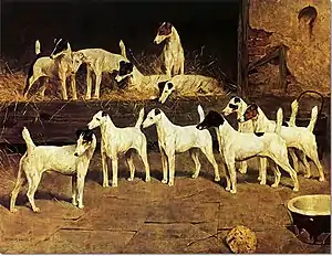 The Totteridge XI was painted by experienced animal painter Arthur Wardle, and was commissioned by Fox Terrier breeder Francis Redmond.[1] Redmond took a high level of interest in the painting, with Wardle remarking many years later, "Mr Redmond stood over me and made me 'perfect' all his dogs – shorten their backs, lengthen their necks and muzzles, make their ears and feet smaller than they really were – and so on. None of them were half as good as in their picture".[2] Such were the corrections insisted upon by Redmond, that an outline of a completed painted over dog can be seen to the right of the painting,[2] and where corrections were made to individual dogs, the original lines are still hazily visible.[3]