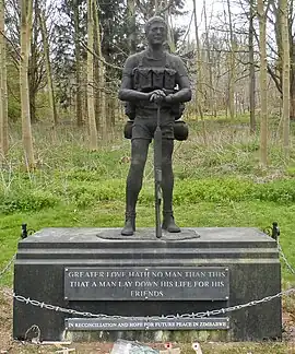 Later, the statue was installed in the grounds of Hatfield House in England on the river Lea and was rededicated by Robert Gascoyne-Cecil, 7th Marquess of Salisbury on 28 September 2008.[1] The rededication included a new plaque stating, "In reconciliation and hope for future peace in Zimbabwe" alongside the RLI roll of honour.[13]