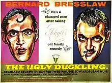 The Ugly Duckling is a 1959 British science fiction comedy film, directed by Lance Comfort and starring Bernard Bresslaw, Jon Pertwee and Reginald Beckwith.[2] The film is a comic adaptation of Robert Louis Stevenson's 1886 Dr. Jekyll and Mr. Hyde storyline and the opening credits include "with ideas stolen from Robert Louis Stevenson". The film has no connection to the Hans Christian Andersen story.[3] The tagline on posters was "He's a changed man after taking Jekyll's family remedy."[4]