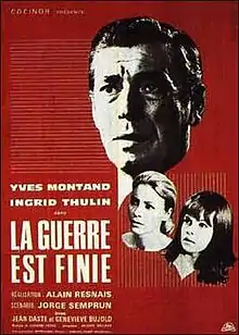 The War Is Over (French: La Guerre est finie-1966) is a French drama war film about a leftist in Franco's Spain, directed by Alain Resnais and starring Yves Montand, Ingrid Thulin and Geneviève Bujold.[1] Joseph Losey directed a sequel, Roads to the South (French: Les Routes du Sud-1978). In July 2021, the film was shown in the Cannes Classics section at the 2021 Cannes Film Festival.[2]