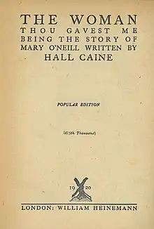 Hall Caine first conceived of the idea for The Woman Thou Gavest Me in 1890 when his two sons visited in him in Rome during his time working on The Eternal City.[2] The idea for the novel gestated during his work on two further novels before The Woman Thou Gavest Me began its serial release in Hearst's Magazine in October 1912 (running for a period alongside the serial of Winston Churchill's The Inside of the Cup).[3] The novel was complete and released in book form in July 1913.[4]
