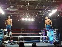 The Young Bucks made their debut for Dragon Gate (DG) in Tokyo, Japan at the Korakuen Hall on May 14, 2008, in a match where they were defeated by Susumu Yokosuka and Ryo Saito.[69] Their first tour of the company spanned from May 14 to June 14.[70] Their second tour started on August 9, 2008, and ended on August 28, 2008.[71] On September 5, 2008, the Young Bucks took part in Dragon Gate's first show in the United States, held in Los Angeles, California, where they unsuccessfully challenged Saito and Yokosuka for the Open the Twin Gate Championship.[72] Their third tour spanned from April 15 to May 5, 2009.[73][74] On May 3, 2009, in Kanazawa, Ishikawa, Matt and Nick successfully defended their PWG World Tag Team titles against Shingo Takagi and Akira Tozawa, the first time the titles had been defended in Japan.[75][76] On May 5, 2009, in Aichi, Japan at the Dead or Alive pay-per-view, The Young Bucks and Ryoma teamed up in a losing effort against Akira Tozawa, Kenshin Chikano and Anthony W. Mori.[74]